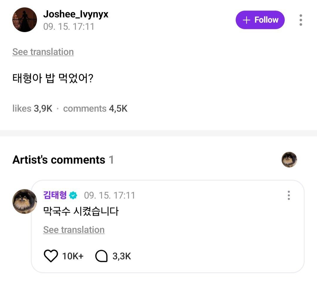🪶 Тэхён прокомментировал пост Арми на Weverse: