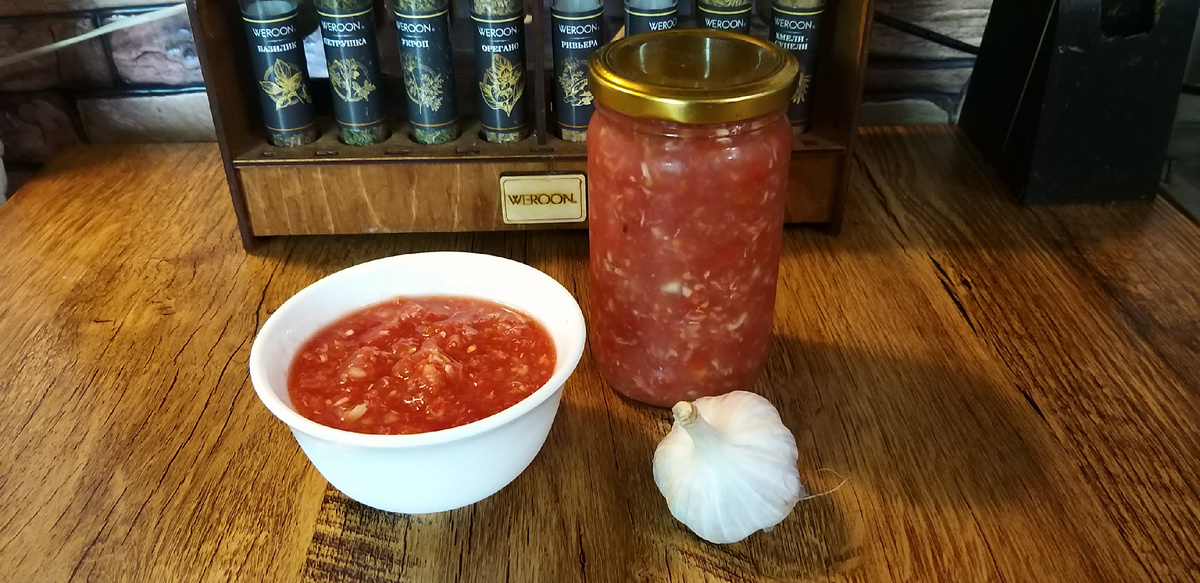 Приветствую любителей домашней еды. Острую закуску огонек готовлю каждый год из хрена, чеснока и помидоров. Она идеально подходит к мясным блюдам. Рецепт приготовления прост: