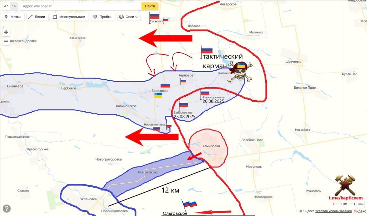 Приятно наблюдать, как гвоздь в украинское темечко начинает менять конфигурацию фронта вокруг этого темечка. ВС РФ молниеносно взяли Ольговское, и тем самым вошли в клинч с Запорожским фронтом на участке от Темировки до Успеновки.