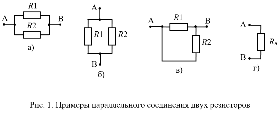 При параллельном соединении резисторы в схеме присоединяются к одной паре узлов, которые на схеме обозначаются точками. Причём неважно, как резисторы расположены в схеме – горизонтально друг над другом (рис. 1, а), вертикально (рис. 1, б) или один горизонтально, другой вертикально (рис. 1, в), или как-то ещё, главное, что один вывод первого резистора присоединён к одному выводу второго резистора, а второй вывод первого резистора присоединён к другому выводу второго резистора.