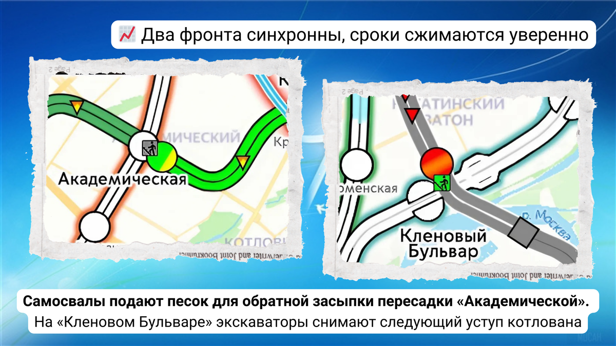 официальные отчеты. Давайте вместе разберемся, что же на самом деле происходит с нашей Москвой. Поехали? Во-первых, окинем взором площадку 🚇 «Академическая» 🏡 Троицкой линии В котловане строительства пересадки приступают к обратной засыпке над верхним перекрытием. Со стороны будущего выхода у д. 24 по ул. Дмитрия Ульянова ведётся строительство выхода – продолжается обуривание будущего котлована. Во-вторых, поглядим на площадку 🚇 станции «Кленовый Бульвар» 🏭 Бирюлëвской линии. Продолжается раскрытие котлована в его южной части. В северной части ведутся работы по устройству