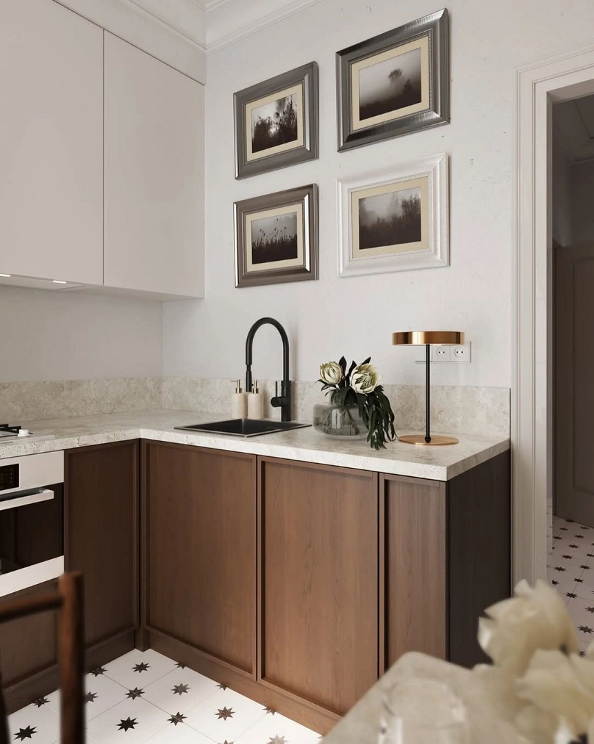 Это могут быть белые, серые, черные и коричневые оттенки, которые сочетаются в отделке, текстиле и мебели. Они создают насыщенный, но сбалансированный интерьер, наполняя кухню энергией и теплом.