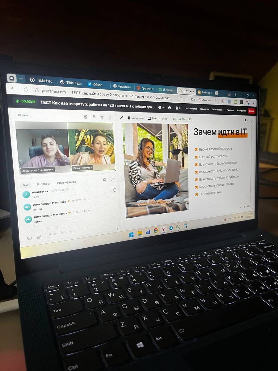 Я вернулась в соцсети и продолжаю вести их, рассказывать, чем занимаюсь, что делаю и какие фишки нахожу. Сегодня хочу поделиться находкой — я в шоке, что такая функция вообще существует. Нашла шикарный способ проводить вебинары, особенно если: • спикеров несколько, • нужна презентация, • и хочется, чтобы всё работало без лишних сложностей. Обычно это приходится настраивать через кучу сервисов — сложно и долго. А тут один сервис, в котором всё включено: просто заходишь и начинаешь. 🔥 Называется он Pruffme — очень простой и удобный. Кстати, завтра мы с моей клиенткой запускаем вебинар по профессии в IT. Если вы или ваши друзья хотели начать удалённую работу — это ваш шанс🍾 Мы познакомились несколько месяцев назад, я настроила ей продажи, а она познакомила меня с этой профессией, которая сейчас на слуху и доступна каждому. Завтра они с Настей (вторым спикером) будeм вести вебинар: • моя клиентка Елена — расскажет про свою онлайн-школу, • Настя — расскажет, как найти сразу две удалённые
