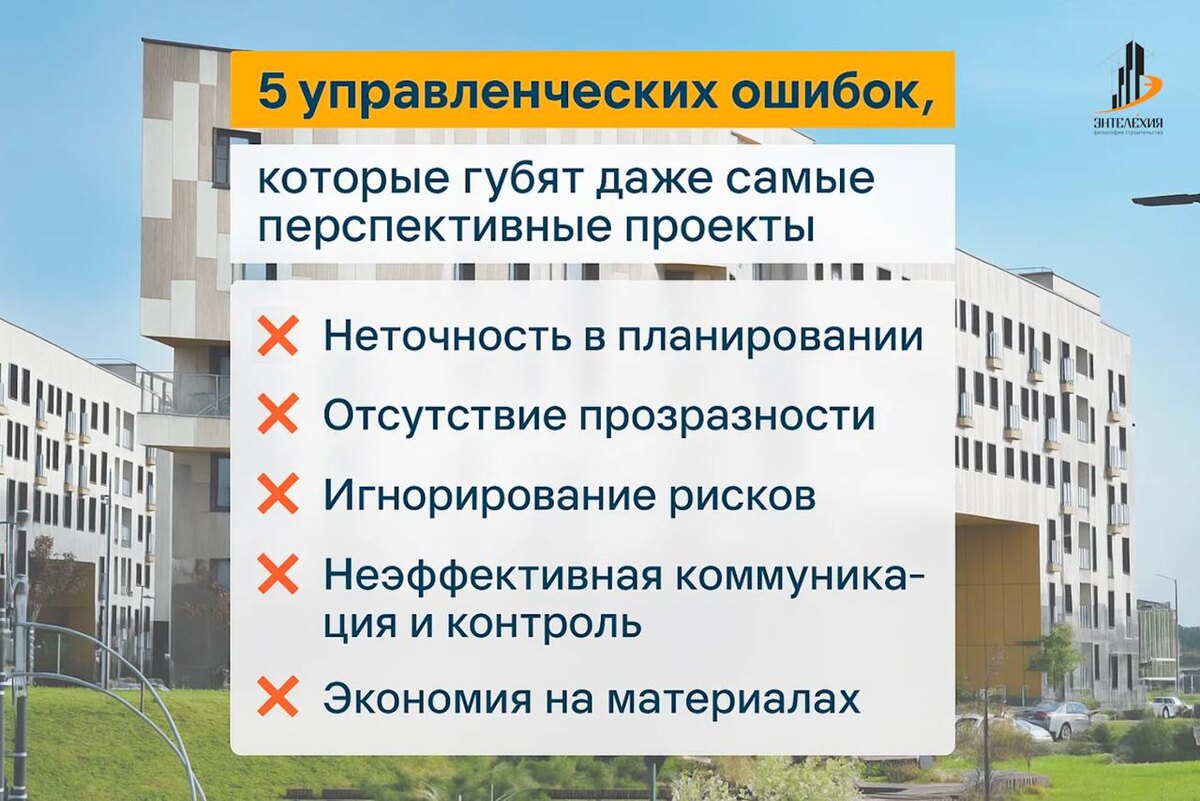 Даже самые амбициозные идеи могут рухнуть не из-за технологий или материалов, а из-за управленческих просчётов. В строительстве это особенно заметно: цена ошибки — колосссальна. Эта проблема актуальна как для федеральных объектов, так и для частных заказов. В «Энтелехии» мы выстраиваем систему так, чтобы предотвратить проблему, прежде чем она возникнет. Сегодня мы расскажем о пяти ошибках, которые часто влияют на результат. Проблема: Некорректная оценка работ и сметы, отсутствие детализированного плана приводят к тому, что проект не укладывается в сроки и бюджет. Наш подход: Мы начинаем с детального анализа и выстраивания выверенного календарного плана и всех затрат, что позволяет исключить ошибки на старте. Финансирование в проектах привязано к фактическому выполнению работ и соответствующей отчётности, что гарантирует точный расчёт на каждом этапе. Если возникает непредвиденная ситуация, наша система позволяет оперативно её проанализировать и устранить. Проблема: Отсутствие единого и