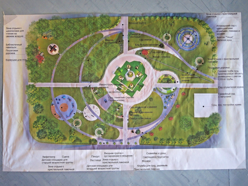 В сквере вокруг храма с 2024 года идёт реконструкция. Проект нового пространства масштабный. Об этом можно судить по карте, представленной в самом храме.