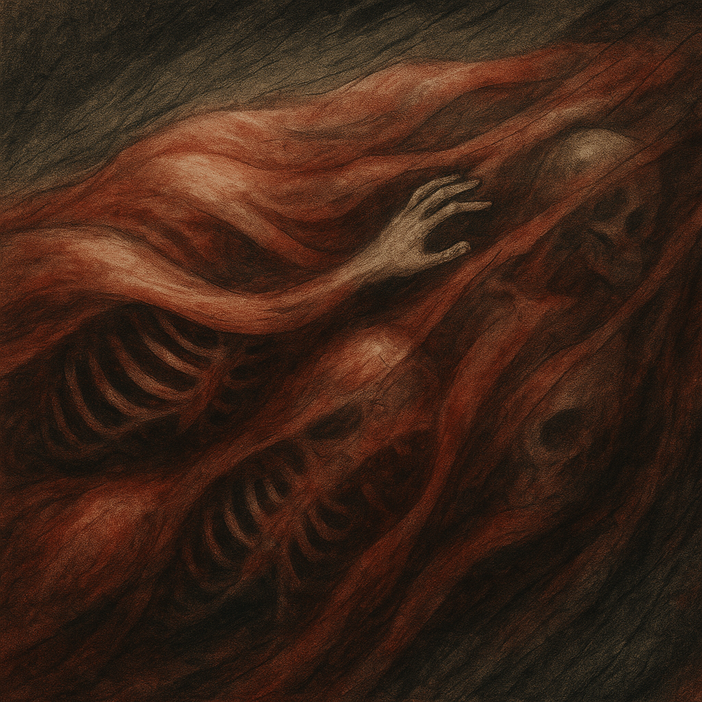 …Гангрена отрубленных и рассечёных до кости пальцев. Окаменелые и всё ещё дышащие желеобразные лёгкие, трясущиеся с кровоточащими дырами, в которых была не только запёкшаяся кровь, но и гниль. Их клетка, к слову, напоминала уже такую же балюстраду из плоти, раскрываясь как живое растение во время каждого вдоха. Раздробленные головы, у которых череп был будто распотрошён дробовиком, челюсть разбита и поделена надвое, глаза вытянуты и сплющены, а затем вся эта смесь была проколота насквозь станком. Головы Джорджи хотелось видеть меньше всего. Это напоминало те самые видео с "расчленёнкой", как говорил один из его "друзей", а та расчленёнка, которую ему показывали равнодушным его не оставили, ведь он вопил от ужаса, а они – смеялись. Масса пульсировала сравнимо с венами, всем своим видом показывая, что вот, сейчас она растает, подобно льду под жарким солнцем. При ближайшем рассмотрении было видно, что масса ни разу не желеобразная. Она походила на страшную болезнь сердца, поневоле представленная как что-то с плотью, жилками и переливающимся градиентом красного всех сортов. Это выглядело отвратительно, а змееподобные остатки людей, чья нижняя часть туловища была заменена остатками кровавой бани, источала запах рвоты, крови и других, не менее мерзких запахов.