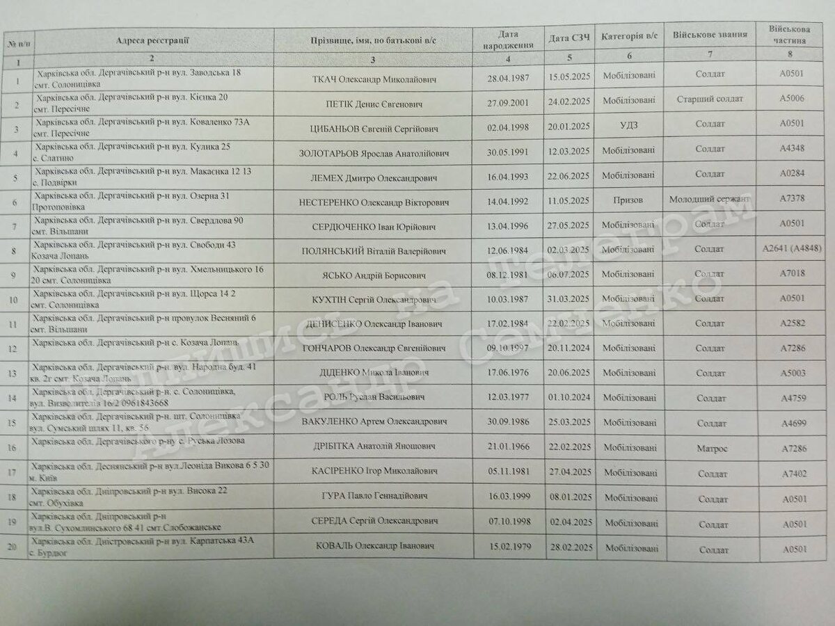 Ещё 152 человека из Харьковской области, сбежавшие из ВСУ. Жители районов, название которых начинается на буквы от «Д» до «К». Больше списков - здесь Что с этим делать - смотреть здесь. Это - хороше подспорье для тех, кому не оставили выбора. Мужики, вас поймают и отправят на мясо. Чтобы избежать этого, нужно объединяться и вести организованную борьбу против тех, кто охотится на вашу жизнь. В списке - ваши потенциальные соратники. Вы все в одной лодке, вы все - дичь для охотников из ТЦК и полиции. Ещё рекомендую внимательно изучить эти материалы. Исключительно, чтобы не попасть в лапы карателей по глупости. Подпишись на Телеграм Александр Семченко