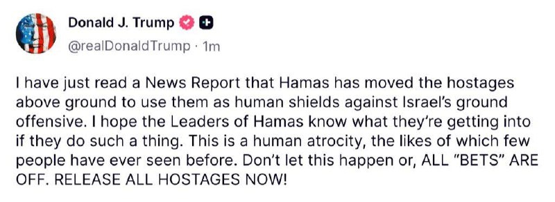 Hamas using hostages as ‘HUMAN SHIELDS’ — Trump ‘Human atrocity’ ‘ALL BETS ARE OFF’ if this happens