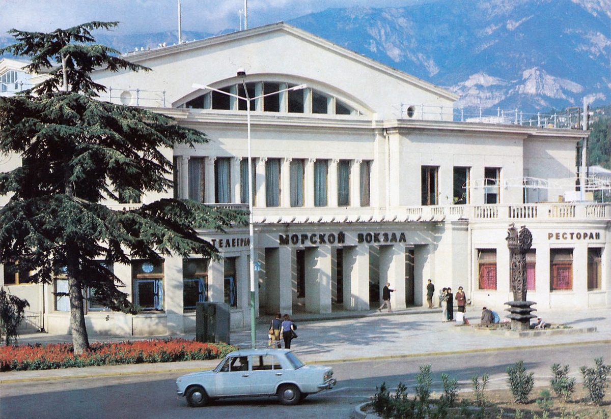 Ялта. Морской вокзал. 1979 год. Автор фото - В. Иванов. Открытка изд. "Планета", Москва, 1981 год. Тираж 2 000 000, цена 2 коп. #Ялта #флот #транспорт #вокзал #ретро #порт