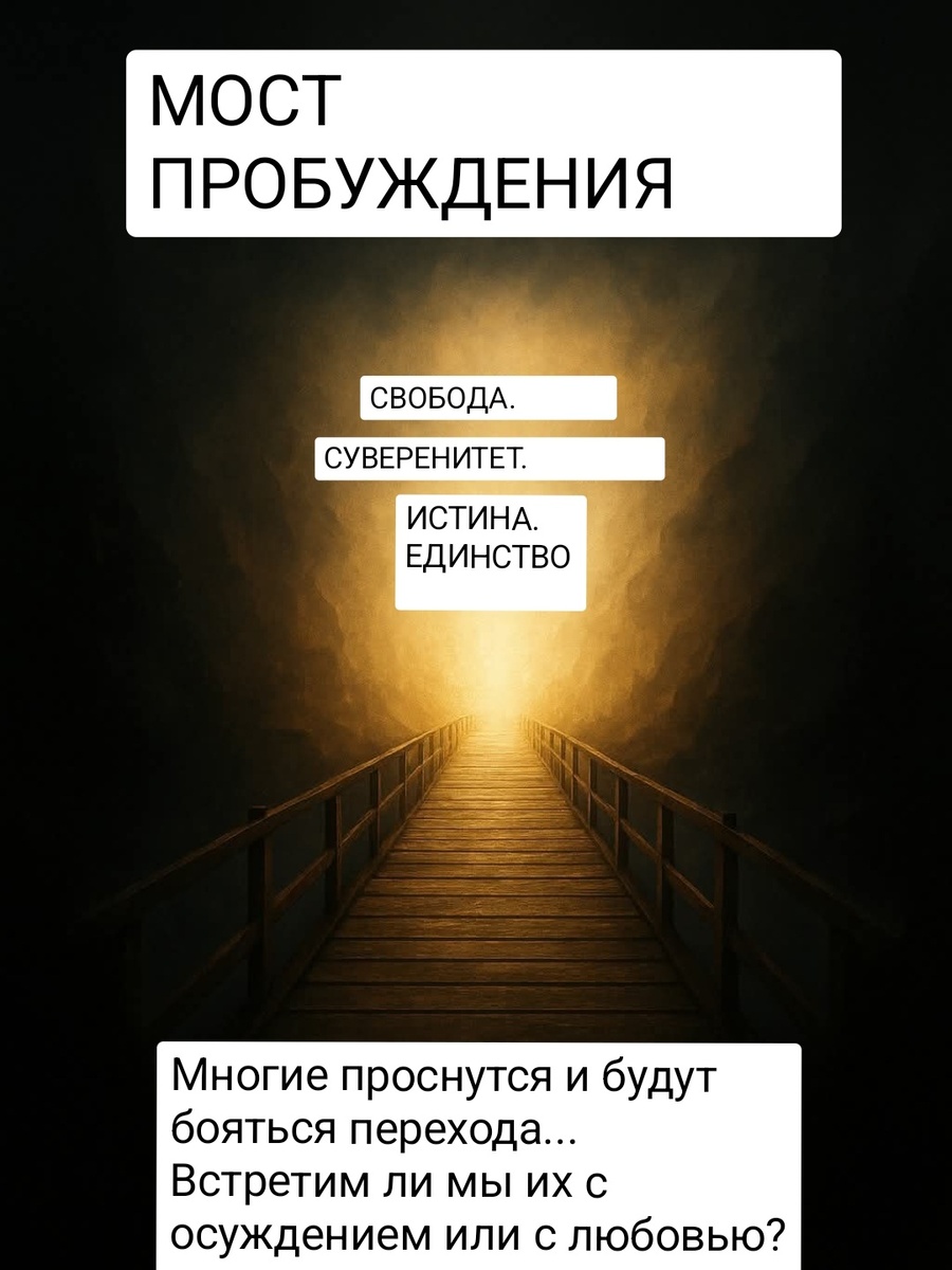 Мы вступаем во времена, когда многие пробудятся к истине. Для некоторых это будет тяжело. Они будут стоять на краю моста, глядя на новый мир, который раньше не видели. По ту сторону — свобода. По ту сторону — суверенитет. По ту сторону — единство, истина и память о том, кто мы есть на самом деле.