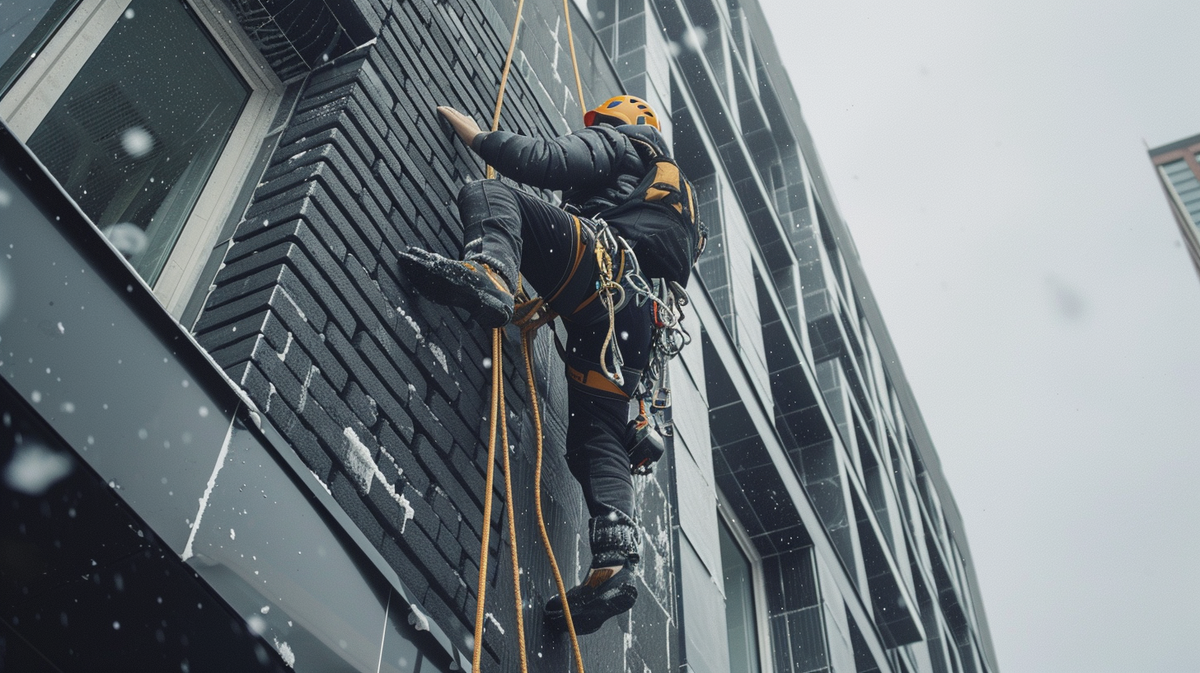 Диагностика профессионального уровня: альпинист проверяет не только видимые участки, но и труднодоступные места — углы, примыкания к балконам, зоны под козырьками.