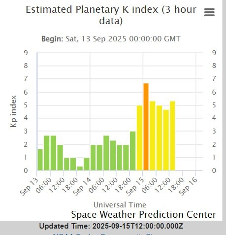 СМИ сегодня весь день пишут о якобы сильной "магнитной буре", что обрушилась на Землю... Давайте немного разберемся в теме. Да, Солне вызвало возмущение в Земной магнитосфере. Причина - огромная корональная дыра, зафиксированная еще 11 сентября. Я об этом уже делал заметку. Да, на 14/15 сентября возмущение учеными прогнозировалось. И оно произошло. Но - насколько сильная буря была? Давайте посмотрим на этот график. На нем отражено изменение Планетарного Индекса Кр, от величины которого и зависит классификация магнитной бури (См подробнее). Кратко: магнитные бури делятся по интенсивности на следующие классы: G0 (Кр = 1-4) G1 Слабая ((Кр = 5) G2 Умеренная ((Кр = 6) G3 Сильная ((Кр = 7) G4 Очень сильная ((Кр = 8) G5 Экстремальная ((Кр = 9) Как видим из графика, максимальный Кр был = 6,75, в очень короткий промежуток времени. В остальное время Кр был чуть больше 5, что соответствует G1 (Слабая магнитная буря). Когда в Крыму мы наблюдали Полярное Сияние, Кр был больше 8. #астрономия #