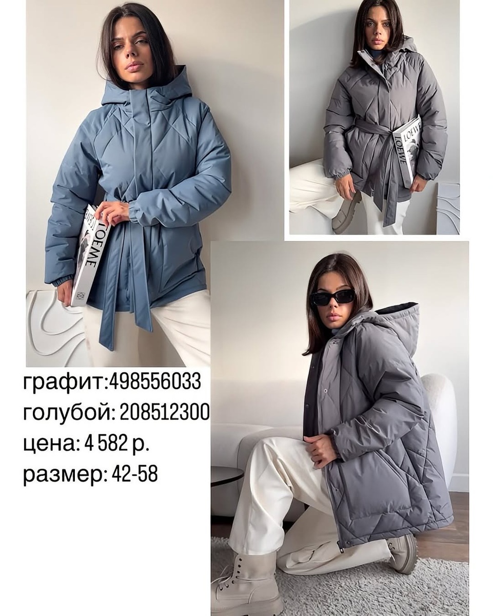 Подобрала для вас утеплённые модели с актуальными силуэтами и спокойной палитрой. Ниже — каждая вещь из фото разобрана отдельно и строго по порядку артикулов, с детальным описанием и «фишками» стилизации. Сохраняйте, это готовая капсула на зиму и межсезонье. Цена: 4 582 ₽ · Размеры: 42–58 Совет стилиста. Чтобы силуэт не казался массивным, завязывайте пояс узлом-«кимоно» и оставляйте концы вертикально — куртка выглядит дороже, а талия становится заметнее. С чем носить: молочные джоггеры/прямые брюки, трикотажный гольф, светлые унты или челси. Из аксессуаров — очки прямоугольной формы и крупный шарф в тон. Цена: 4 582 ₽ · Размеры: 42–58 Совет стилиста. Голубой особенно эффектен с молочным тотал-луком: светлые джинсы, белые кеды/луноходы, шапка-бини цвета сливок. Совет стилиста. Носите вместо пиджака: сверху — кашемировый шарф, снизу — широкие брюки и мокасины на толстой подошве. Совет стилиста. Добавьте контрастный низ (шоколад, графит) и золотые серьги-кольца — мягкий беж не «раство
