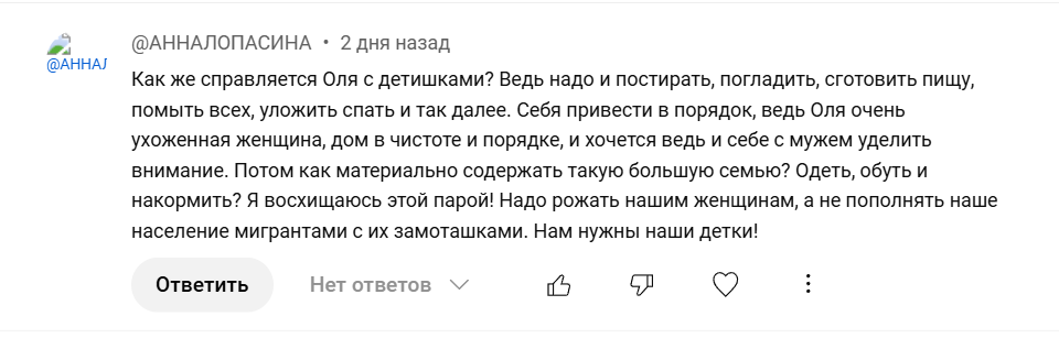 Как же справляется Оля с детишками? Ведь надо и постирать, погладить, сготовить пищу, помыть всех, уложить спать и так далее. Себя привести в порядок, ведь Оля очень ухоженная женщина, дом в чистоте и порядке, и хочется ведь и себе с мужем уделить внимание. Потом как материально содержать такую большую семью? Одеть, обуть и накормить? Я восхищаюсь этой парой! Надо рожать нашим женщинам, а не пополнять наше население мигрантами с их замоташками. Нам нужны наши детки! Ваша любимая рубрика «Ответы на комментарии» наконец-то вернулась! За последние две недели произошло столько событий, что я думала, что не выдержу... Нет, ну правда! Сначала беспокойство из-за тринадцатой беременности и досадного токсикоза. А потом — 1 сентября, праздничное мероприятие и торжественная линейка. Впервые каждый мой ребёнок-ученик преподнёс учителям большие букеты цветов. И вот казалось, что всё хорошо начинается, но нет... Уже на следующий день жизнь разделилась на ДО и ПОСЛЕ. В реальность происходящего верил
