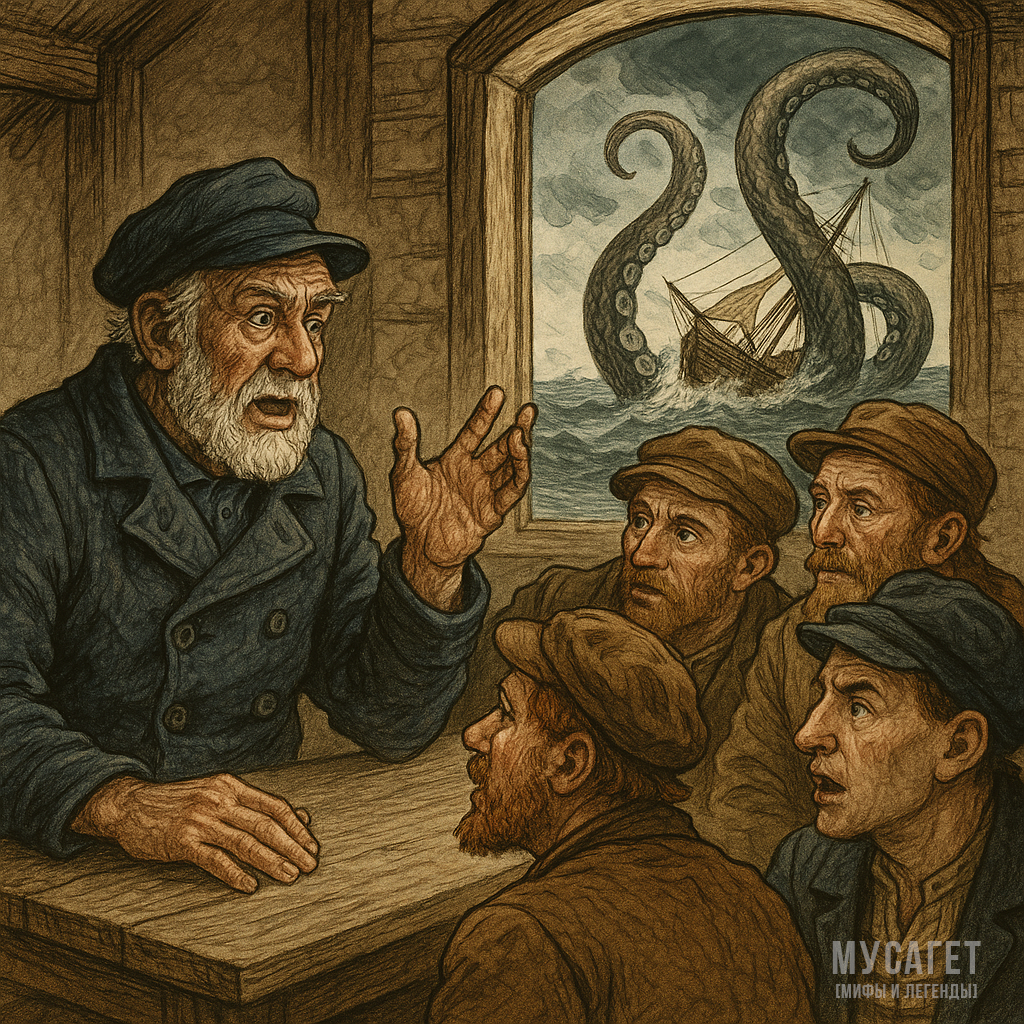 «А потом, прямо из чёрной пропасти, из моря, вдруг поднялась громадная щупальца и ударила по борту! Даже бывалые матросы визжали, как резаные поросята. Такого страху мне не приходилось натерпеться ни разу!» – уверенно рассказывал пожилой моряк.