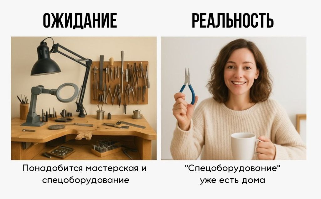 До того как начала заниматься ювелирной бижутерией, мне казалось, что нужны огромный верстак, паяльники, лупы и целый чемодан инструментов
