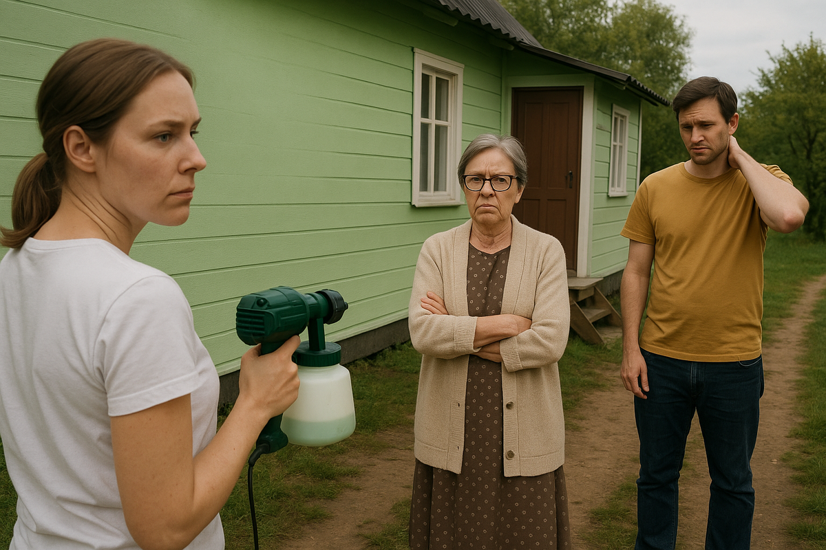 Я обернулась, держа в руке краскопульт. Нежно-зелёная стена нашего дачного домика уже сияла свежестью. На тропинке, сжав губы в тонкую линию, стояла Галина Петровна — моя свекровь. Рядом переминался мой муж Кирилл, виновато гладя ворот футболки.