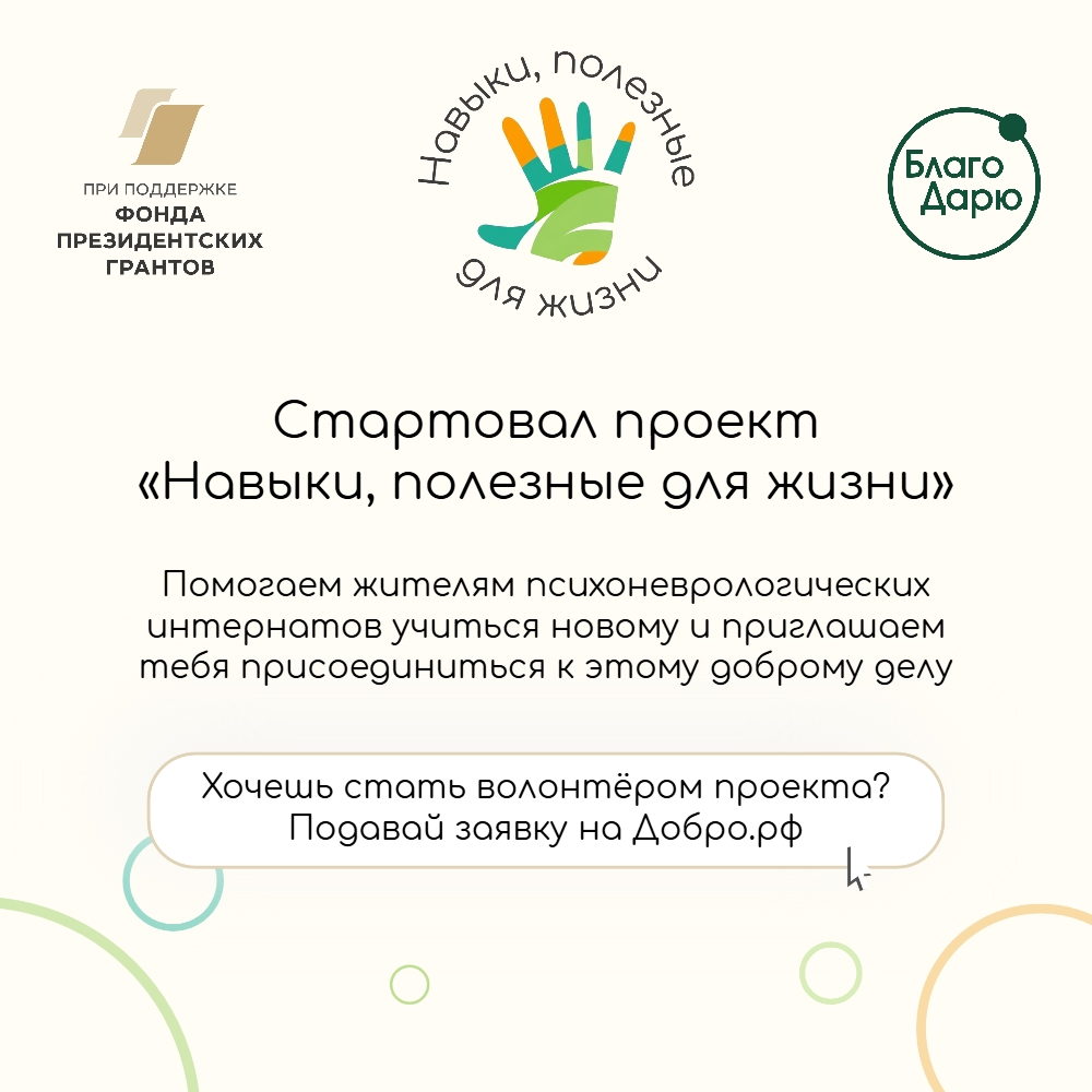 Уточняется, что в планах - проводить занятия по швейному делу, растениеводству, декоративно-прикладному искусству, театральному мастерству и другую творческую деятельность. Ожидается, что постоянное взаимодействие с волонтёрами и командой проекта поможет жителям ПНИ стать более открытыми и общительными.