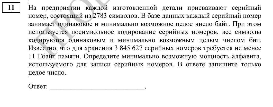 Задача из демоверсии 2026 года по информатике с сайта ФИПИ. В первую очередь формулы. N = 2**i I = K * i Iобщ = I * n N - мощность алфавита (количество символов в используемом наборе) i - вес одного символа в битах (просто размер одного символа из используемого алфавита) I - размер в битах пароля, номера или идентификатора (в зависимости от контекста задачи) K - количество символов в идентификаторе, номере или пароле (опять же, смотря что в задаче) Iобщ - общий объем в битах всех идентификаторов, номеров или паролей n - количество паролей, номеров или идентификаторов К решению задачи. Пишем дано: K = 2783 В базе данных каждый серийный номер занимает одинаковое и минимально возможное целое число байт Это означает, что когда найдем размер в битах одного серийного номера, результат нужно разделить на 8 - перевести в байты При этом используется посимвольное кодирование серийных номеров, все символы кодируются одинаковым и минимально возможным целым числом бит. Это отсылка к формуле I = K *