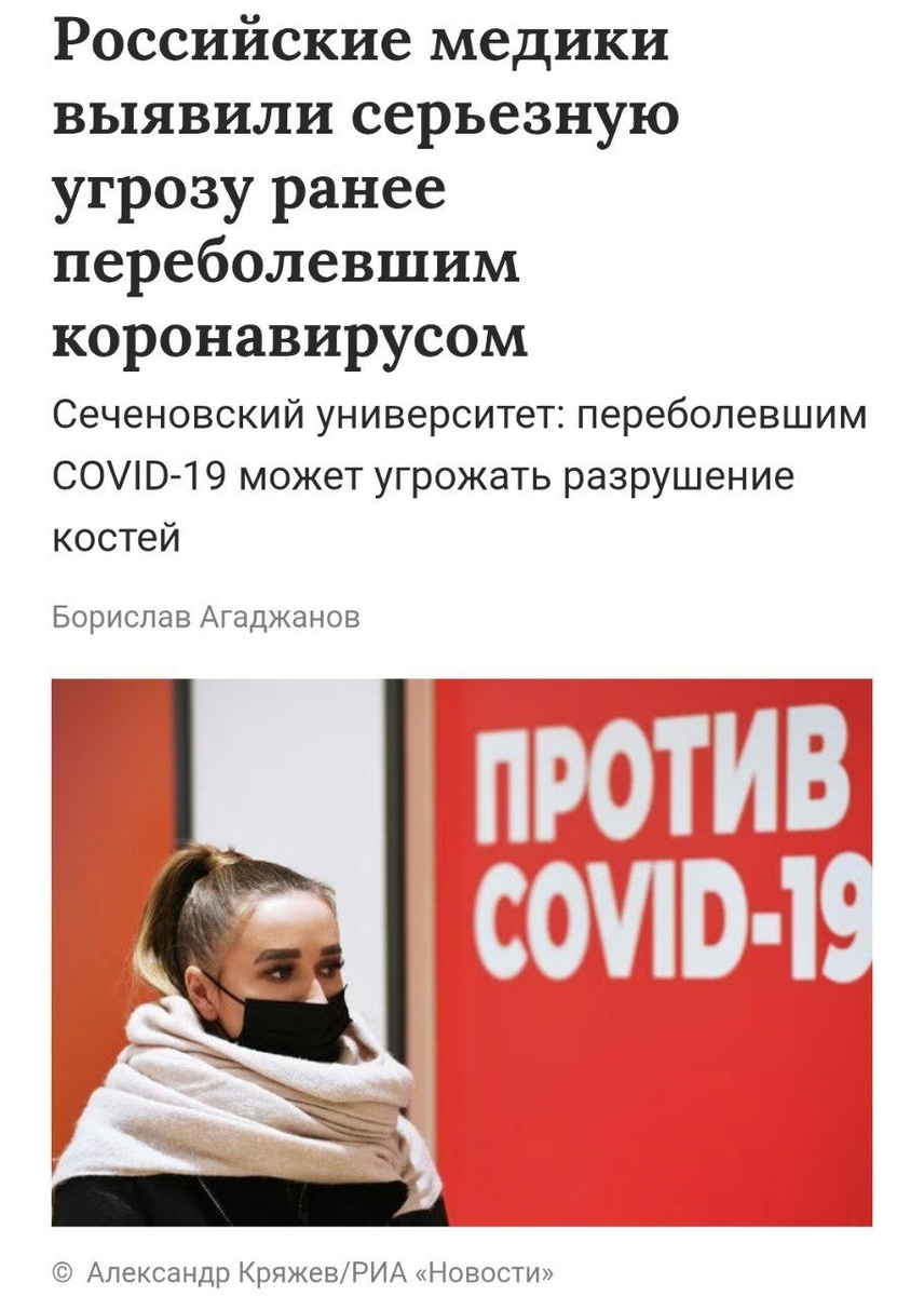 😷 Всем переболевшим COVID-19 грозит разрушение костей — российские учёные нашли связь коронавируса с постковидным остеонекрозом. Болезнь нарушает кровообращение и приводит к гибели костной ткани. Это сопровождается сильнейшей болью и потерей подвижности суставов, а в итоге человеку может понадобиться замена их протезом. Врачи советуют: любые боли в костях после COVID — повод срочно обращаться к врачу и не игнорировать обследование. ⭐️ LPG
