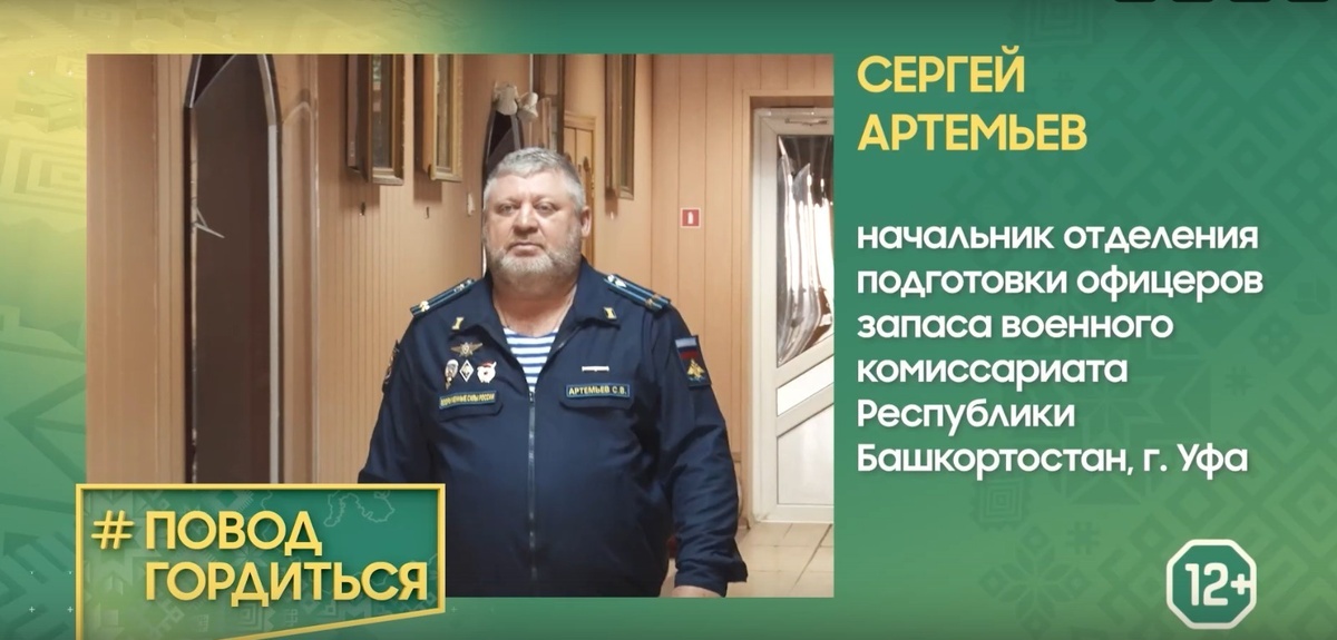 Героем очередного выпуска проекта ЦУР Башкортостана и ТВ-канала БСТ «Повод гордиться» стал начальник отделения подготовки офицеров запаса военного комиссариата Республики Башкортостан, подполковник запаса Сергей Артемьев. Сергей Викторович - выпускник Омского высшего танкового инженерного училища, ветеран боевых действий – в 1995 году командовал ротой в Чечне.