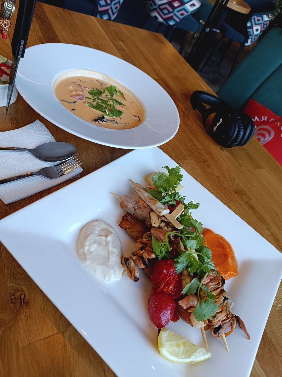 Вот такой вкусный у нас сегодня ужин. Муж позвал меня после работы в Мидийное место перекусить. Он взял том ям, я мини-шашлычки из креветок, тунца, кальмара и мидий.