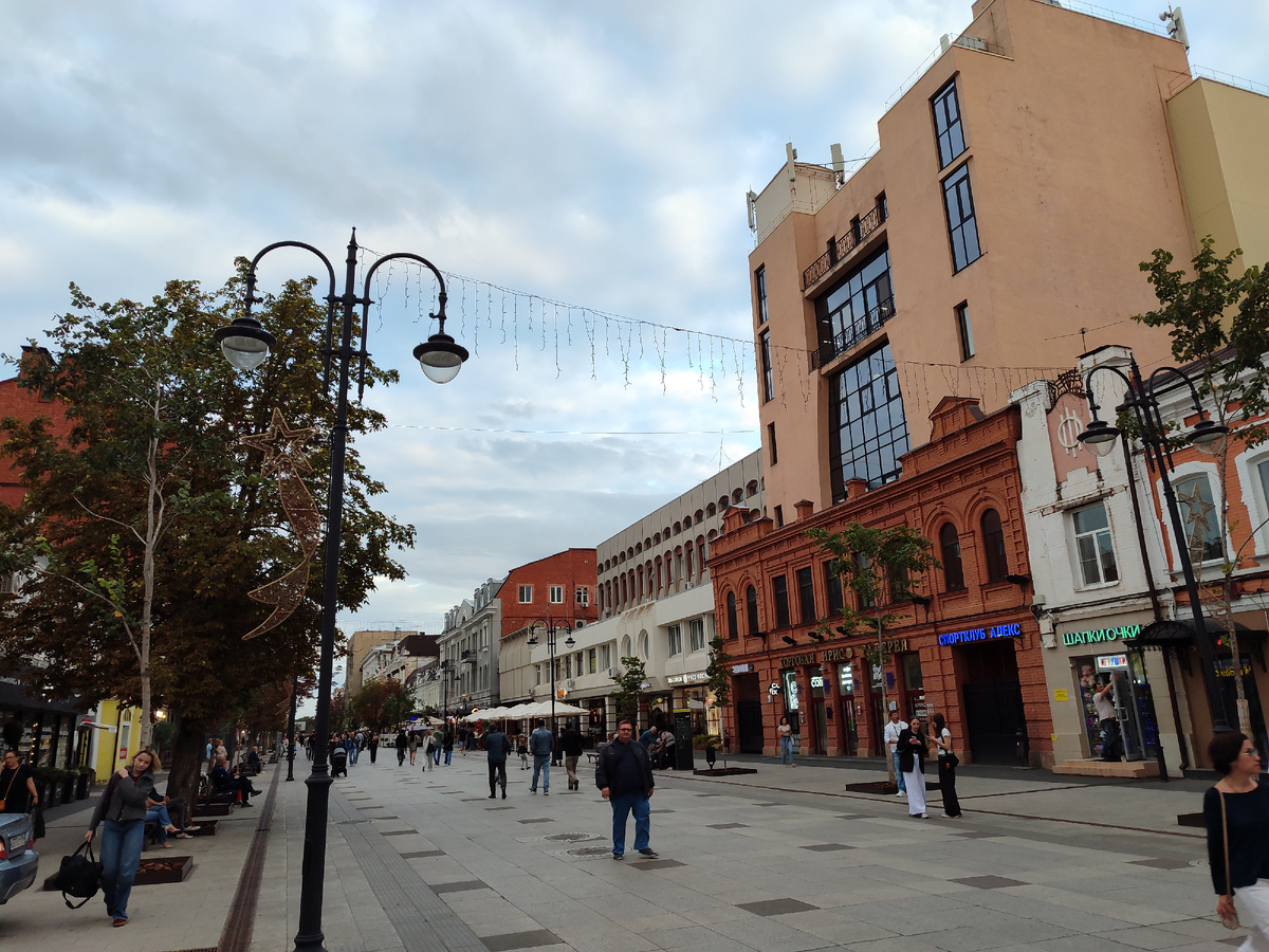 К сожалению, во время нашей прогулки не будет солнечных кадров. Но немного из того изобилия огней золотых на улицах Саратова, мгновенно всплывающих в памяти при упоминании этого города, я вам конечно же покажу. Пешеходное кольцо проходит по исторической части города через Набережную Космонавтов, улицы Волжскую и Октябрьскую, проспект Столыпина, площадь Кирова, улицу Рахова и парк Горького. Мы начнём с Волжской улицы, первой ставшей пешеходной в 2016 году.