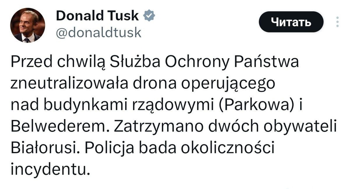 ❗️Служба государственной охраны недавно нейтрализовала беспилотник, действовавший над правительственными зданиями (улица Парковая) и дворцом Бельведер. Двое граждан Беларуси были задержаны. Полиция расследует обстоятельства инцидента, - Туск После сообщения премьера Польши о том, что над правительственным зданием обезвредили дрон, поляки в комментариях выражают недоверие руководству, утверждая, что оно сознательно нагнетает ситуацию 😏 Видимо недавний инцидент с БПЛА руководство Польши сильно напугал 🌧 Подписаться на канал | Наш чат Мы в ВКонтакте
