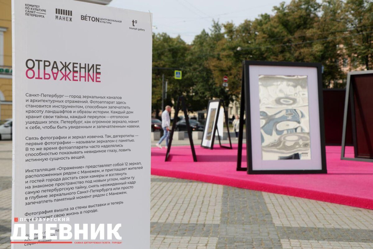 🪞 «Отражение» у Манежа: Петербург с другого ракурса У западного фасада Манежа открыта инсталляция «Отражение». Двенадцать зеркал создают необычное пространство, где город можно увидеть в новом свете — с неожиданного ракурса, через игру отражений и бликов. Прохожие могут не только любоваться инсталляцией, но и сами стать частью её образа, снимая кадры в глубине зеркального города. Инсталляция работает до 5 октября. Фото: Олег Золото Подписаться на Петербургский Дневник в MAX