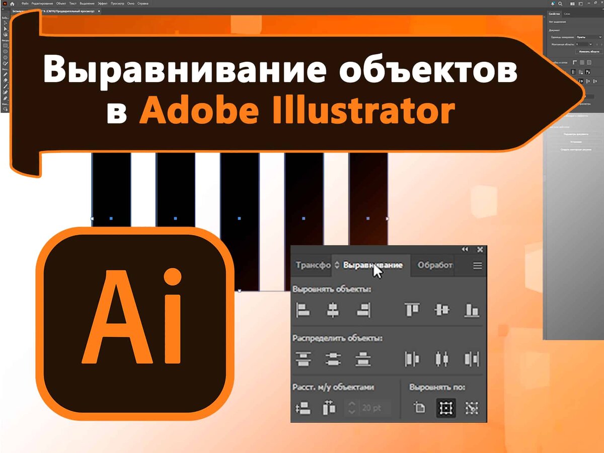 В этом коротком уроке рассмотрим как равномерно выровнять объекты в векторном редакторе Adobe Illustrator 1. Выделяем все объекты. 2. Затем переходим во вкладку "Окно" и в выпадающем списке выбираем "Выравнивание". 3. В открывшем окне используем два параметра "Выровнять по выделенной области и "Выровнять по ключевому объекту".
