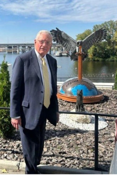 Кит Келлог в Киеве на фоне памятника коту. Себя он тоже считает котом, так как Кит — по-украински Кот