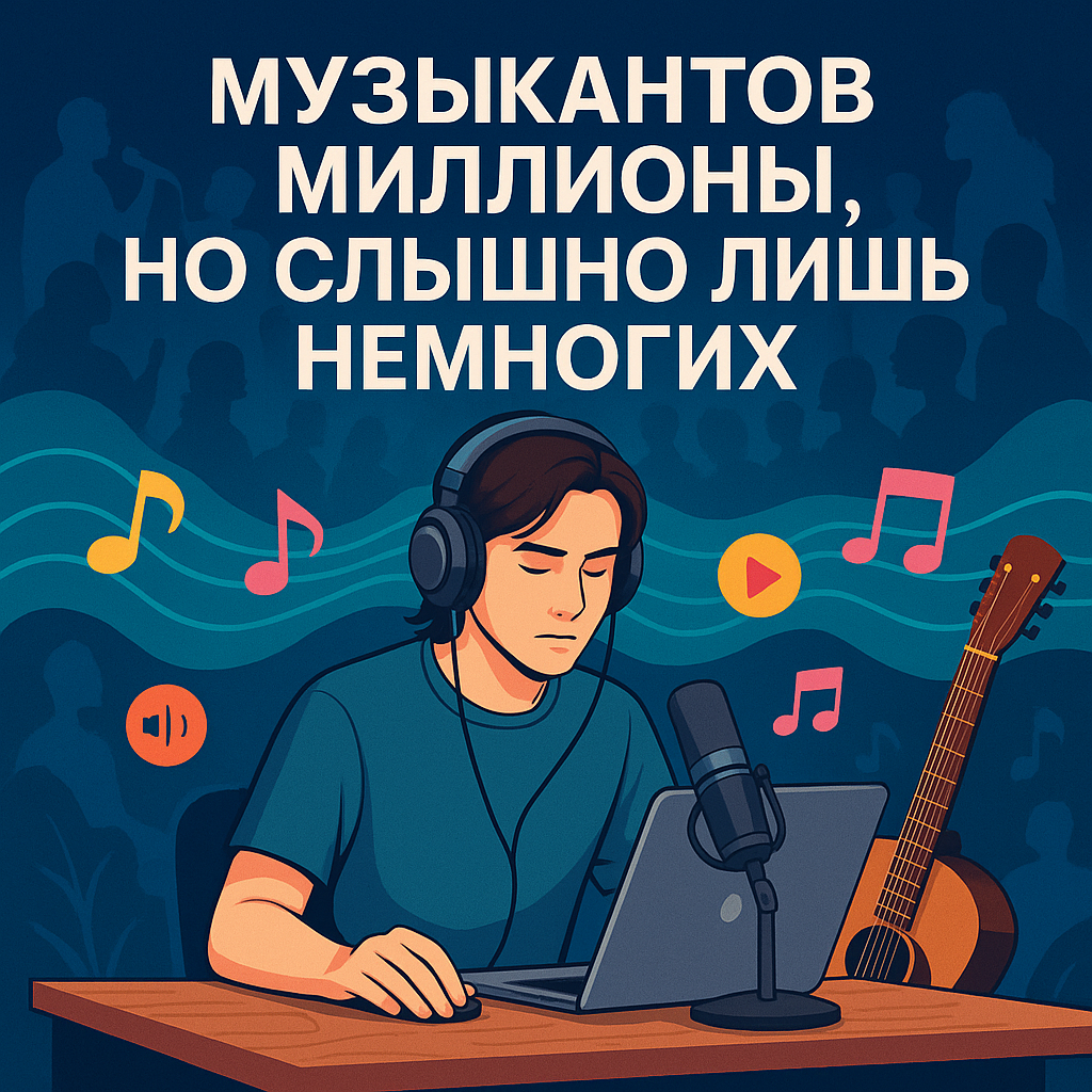 Представьте себе огромный океан. На поверхности — хиты, плейлисты, сцены, интервью. Под водой — миллионы песен, которые никто никогда не услышит. Так устроена музыкальная индустрия: по данным IFPI и Spotify, сегодня в мире более 75 миллионов треков доступны на стримингах, а только Spotify ежедневно добавляет более 120 000 новых треков. Согласно разным оценкам, в мире более 50 миллионов людей, которые пишут, играют или поют музыку — но лишь небольшая часть из них публикует свои работы, и ещё меньшая становится заметной аудитории.