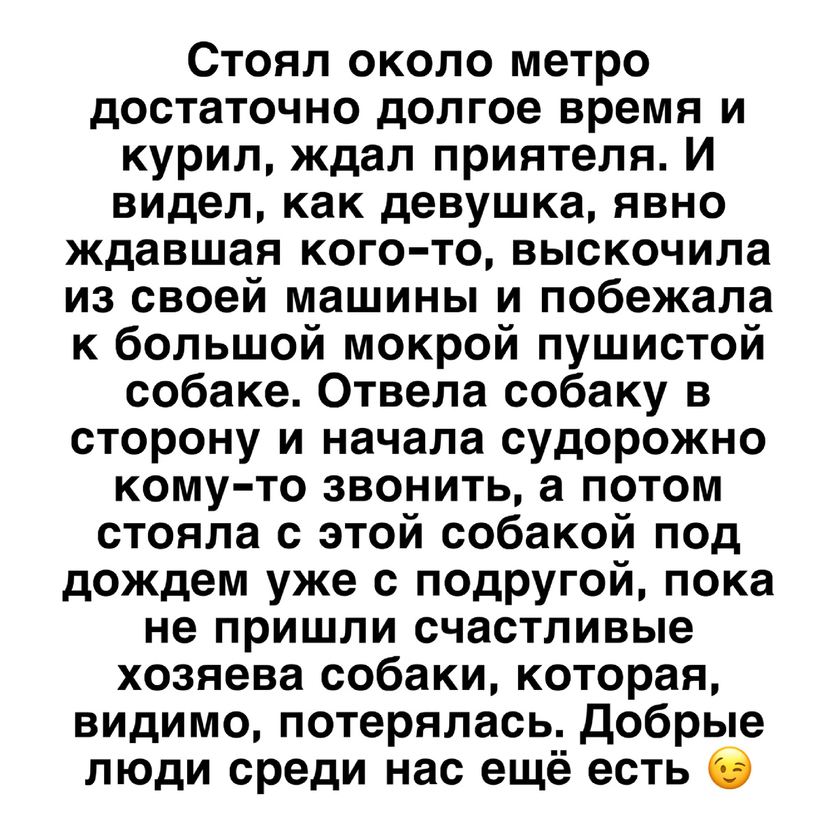 Стоял около метро достаточно долгое время и курил, ждал приятеля. И видел, как девушка, явно ждавшая кого-то, выскочила из своей машины и побежала к большой мокрой пушистой собаке. Отвела собаку в сторону и начала судорожно кому-то звонить, а потом стояла с этой собакой под дождем уже с подругой, пока не пришли счастливые хозяева собаки, которая, видимо, потерялась. Добрые люди среди нас ещё есть 😉