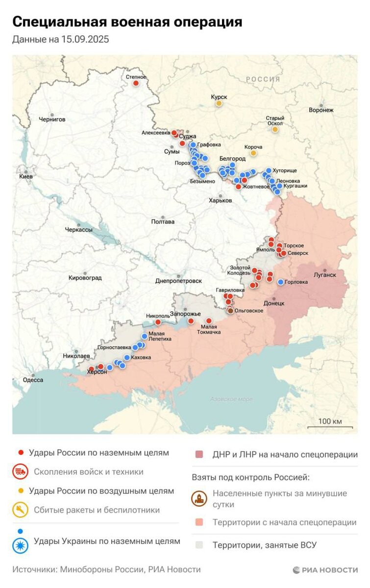 Спецоперация. Обстановка и главные события на 15 сентября. ▪️Российские войска освободили Ольговское в Запорожской области. ▪️ВСУ за сутки потеряли до 1435 военнослужащих, три танка, 17 бронемашин. ▪️Медведев заявил, создание бесполётной зоны над Украиной и возможность стран НАТО сбивать российские беспилотники будет означать войну альянса с Россией. ▪️НАТО де-факто воюет с Россией, это очевидно и не нуждается в доказательствах, заявил Песков. ▪️Власти Украины расширили зону принудительной эвакуации семей с детьми на ещё 18 населённых пунктов Днепропетровской области. Источник - РИА Новости