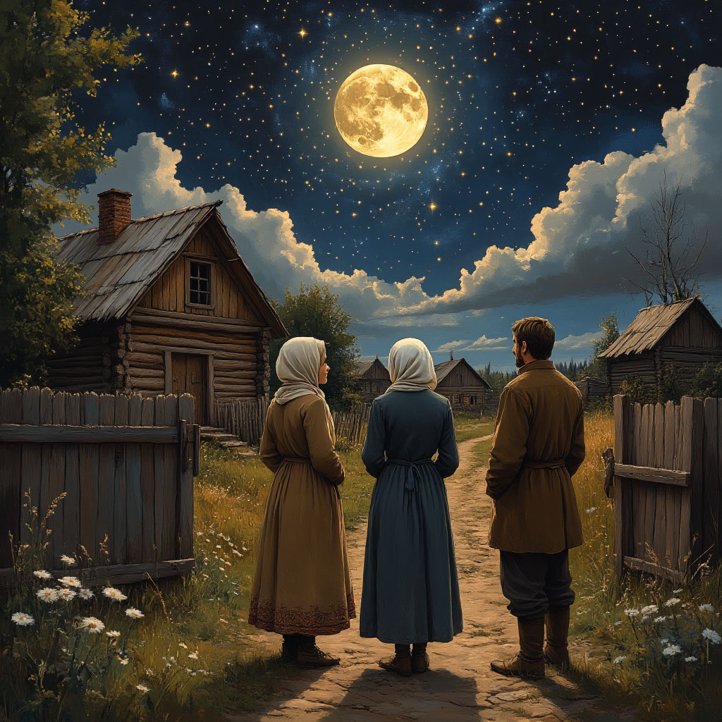Глубокая ночь окутала деревню непроглядной тьмой. Луна спряталась за тучи, и только редкие звёзды освещали заснеженные улицы. Анна внезапно проснулась, почувствовав первые схватки. Она осторожно толкнула Сашку в бок: