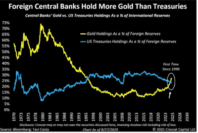 Теперь центральные банки снова предпочитают золото в виде безопасного актива против казначейских облигаций. Произошло фундаментальное изменение в восприятии и общепринятых представлениях о казначейских облигациях как безопасном активе.