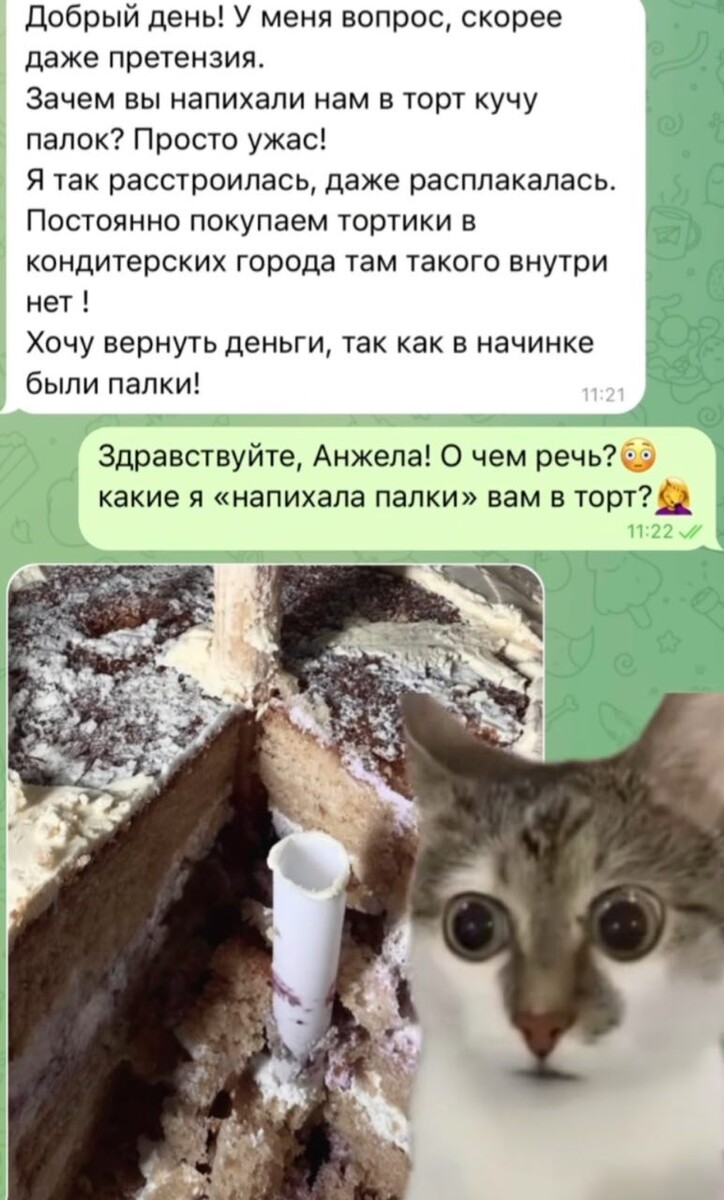 "Здравствуйте! Отдавала детский торт в один ярус, на следующий день получила такие сообщения: Сначала я растерялась. Торт, который я пекла для заказчицы, был небольшой (2 кг), там никак не могло быть опор ("палок"). Ягоды и шоколадная фигурка - вот и весь декор, даже крепежных шпажек не было. То, что речь идет именно про опоры, я поняла сразу. На фото видно, что снят верхний ярус. В итоге оказалось, что речь идет совершенно о другом торте, который делала другая кондитер. С тем, что на один праздник заказывают два бисквитных торта у разных кондитеров, столкнулась впервые..., а практика у меня за 7 лет - огромная. Более 8000 тортов за плечами. Да, кондитер обязательно должен предупреждать, что внутри торта есть крепежные элементы конструкции! Обычный покупатель-заказчик не может разбираться в техническом вопросе сборки ярусных тортов. Можно получить очень серьезные травмы, это реально опасно! Упущение коллеги-кондитера - на лицо. Но на мой взгляд, просить у нее возврат денег - тоже как-т