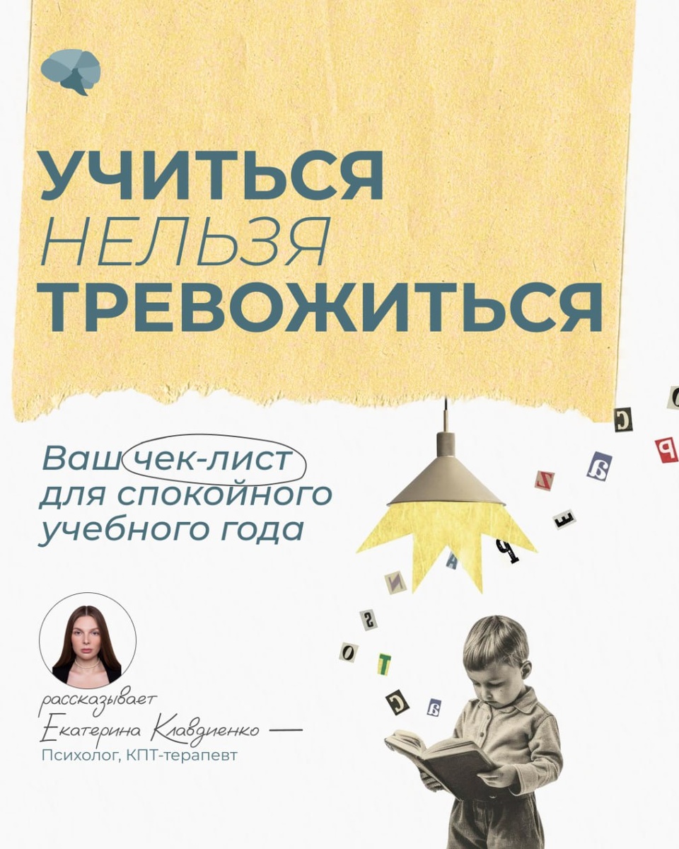 Учиться нельзя тревожиться Рабочий чек-лист для всех, кто начинает учебный год. Начало учебного года — период адаптации. Свободное время сокращается, нагрузка растет, а мысли о будущих экзаменах вызывают напряжение. Это нормально. Главное — знать, как себе помочь. Мы подготовили для вас структурированный план, который поможет войти в процесс плавно, минимизируя стресс. Цель: Сохранить ментальное здоровье и продуктивность. 🧠 Пункт 1: Когнитивная подготовка (Работа с мышлением) 🌟«Мысленная инвентаризация»: Выпишите все тревожные мысли об учебе. Это помогает объективировать страх. 🌟Челлендж для катастрофизации: Задайте к каждой мысли вопросы: "Какие доказательства?", "Что худшее может случиться и как я с этим справлюсь?". 🌟Фокус на процессе: Цените не только оценки, но и приложенные усилия. 🏃♂️ Пункт 2: Поведенческая активация (Работа с действиями) 🌟Режим сна: Основа основ. Гаджеты — за час до сна. 🌟Планнер: Внесите в него не только дедлайны, но и обязательное время на отды