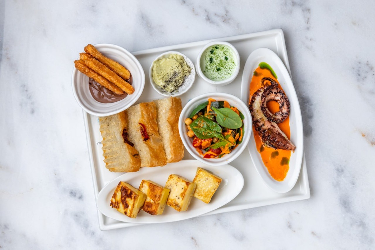 Среди морских сетов-конструкторов и блюд a la carte вроде запеченного омлета с тартаром из красных лангустинов и драника из цукини с щучьей икрой и яйцом пашот выделяется испанский сет с осьминогом, тортильей, зеленым йогуртом, чуррос и прочим.