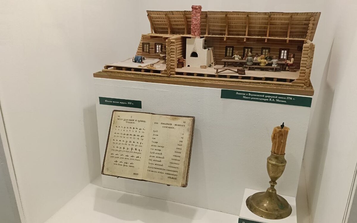 Экспозиция музея начинается с XVII века – с допетровской эпохи. Первые школы на воронежской земле стали открываться в годы правления первого воронежского архиерея, епископа Митрофана. Как правило, учебные заведения находились в местах, обживаемых украинскими переселенцами. Они открывались при церквях, а грамоте детей обучали дьячки или «мастера грамоты» – странствующие учителя, которые занимались с детьми за определенную плату.