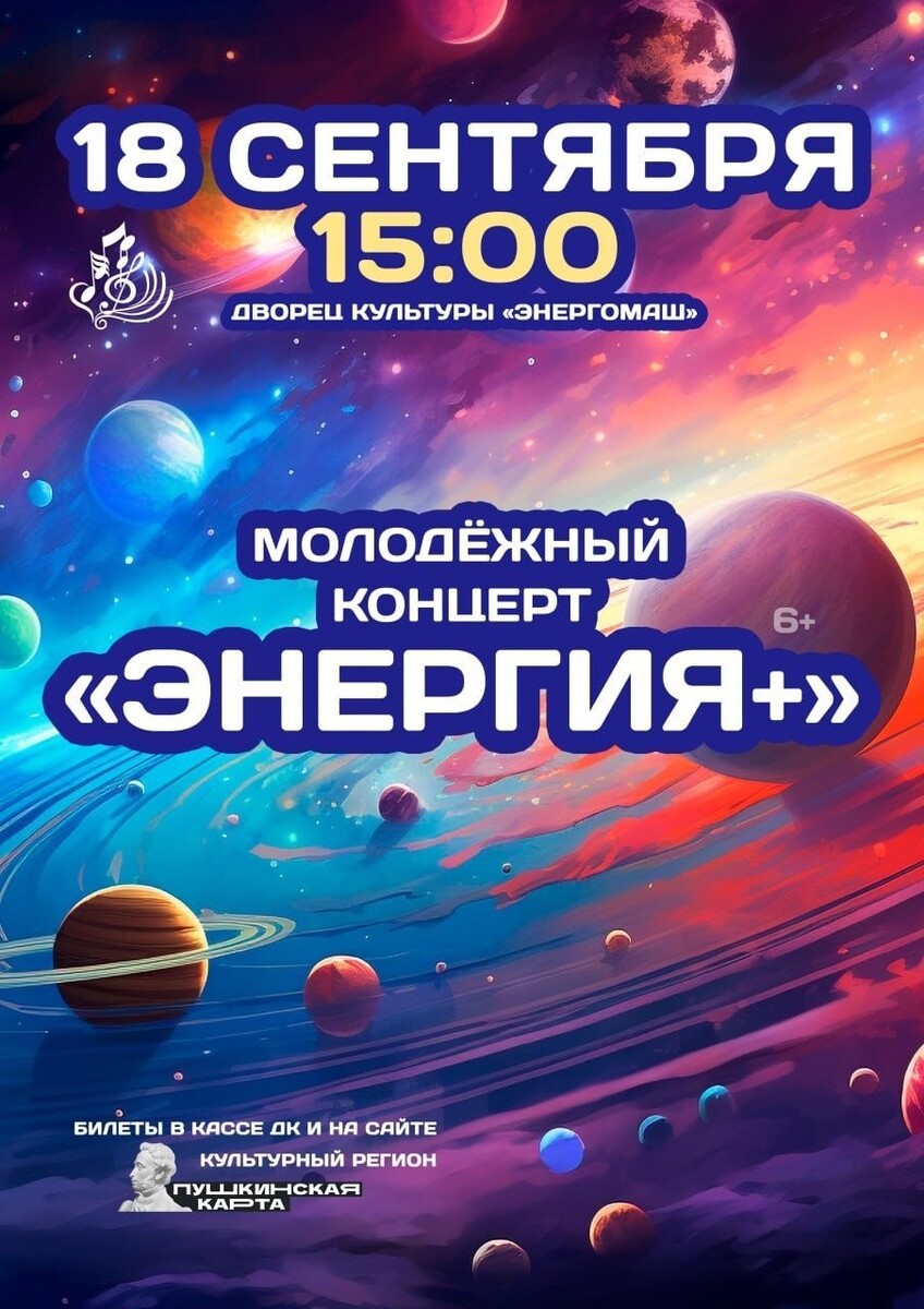 🚀 Друзья, приглашаем вас отправиться в удивительное путешествие на планету «Энергия+»! ⭐️ Вас ждут невероятные открытия, яркие эмоции и море позитива в компании талантливых ребят из молодежных коллективов Дворца культуры Энергомаш! ✨ Когда: 18 сентября, ровно в 15:00 🌍 Место встречи: Дворец культуры Энергомаш Вместе мы погрузимся в мир творчества, энергии и вдохновения! Не упустите шанс стать частью нашего большого праздника и зарядиться позитивом на весь учебный год! Возможна оплата Пушкинской картой. Билеты по ссылке https://bel.cultreg.ru/events/437720/molodezhnyi-koncert-energiya #энергия #энергомаш #молодежь #творчество #путешествие
