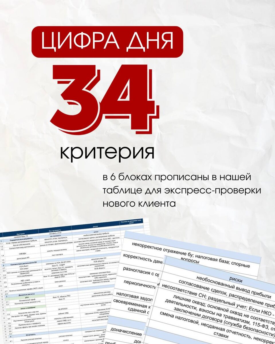 Как оценить риски в начале работы с клиентом Большинство бухгалтеров берут клиента в работу без диагностики. А значит, сюрпризы вскрываются уже после подписания договора. Для бухгалтера это ответственность за чужие хвосты. Для клиента — штрафы, доначисления, споры с налоговой, а иногда, административная или даже уголовная ответственность. Мы собрали таблицу, где все критерии оценки рисков сгруппированы в 6 блоков: ⭕️учредительные документы, ⭕️соответствие деятельности системе налогообложения, ⭕️ денежные расчёты, ⭕️ касса и эквайринг, ⭕️ отчётность, ⭕️ кадры и зарплата, ⭕️ отдельный блок есть для отраслевых особенностей. Эта таблица помогает провести экспресс-анализ клиента и показать ему риски: от нарушения 54-ФЗ до занижения налоговой базы, от несоответствия СН до проблем с сотрудниками. Она не заменяет полноценную диагностику, но даёт предварительную оценку: подсказывает, где подстелить соломку и о каких рисках предупредить клиента. 📌 Эта таблица — часть Стандарта «Ввод клиен
