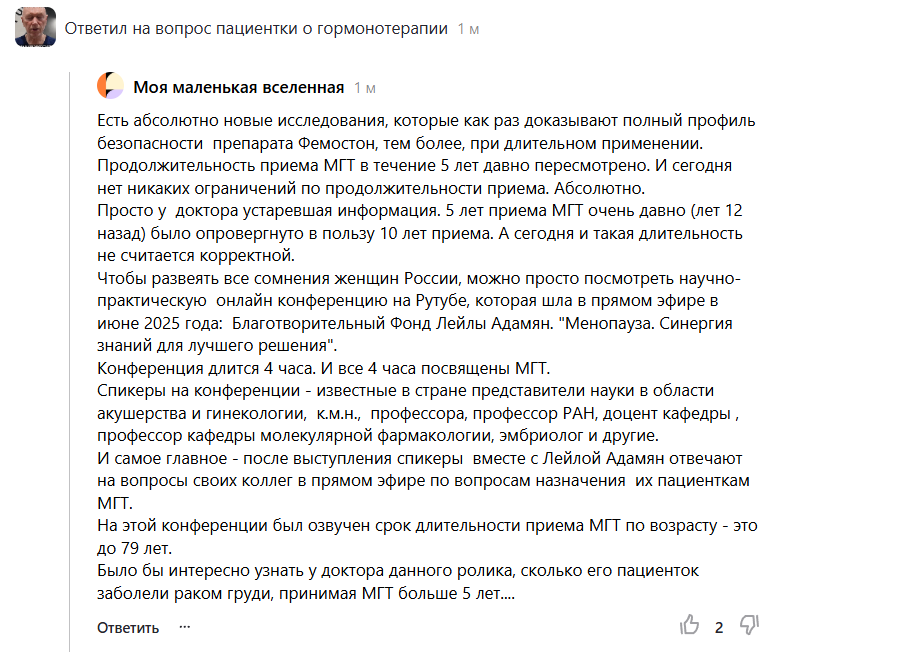 Мой комментарий о выступлении: вывод Марии Игоревны об отсутствии риска развития рака молочной железы при МГТ эстроген-дидрогестерон не справедлив.