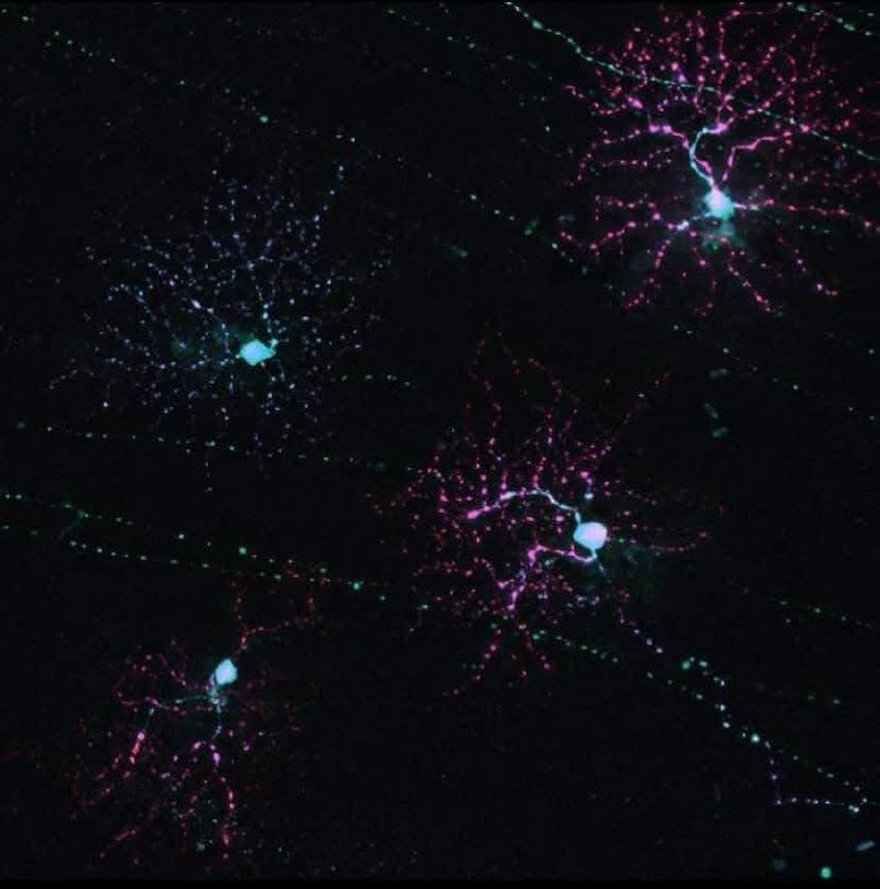 На фото представлена конфокальная микроскопия ганглионарных клеток (нейронов сетчатки глаза), которые несут в мозг и производят первичную