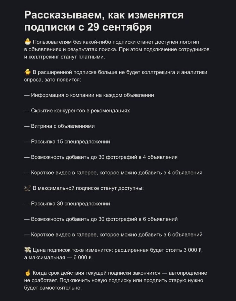 ΠΈ ΠΏΠΎΠΈΡΠΊΠ΅. ΠΠΎ: ΠΏΠΎΠ΄ΠΊΠ»ΡΡΠ΅Π½ΠΈΠ΅ ΡΠΎΡΡΡΠ΄Π½ΠΈΠΊΠΎΠ² ΠΈ ΠΊΠΎΠ»Π»ΡΡΠ΅ΠΊΠΈΠ½Π³ β ΡΡΠ°Π½ΡΡ ΠΏΠ»Π°ΡΠ½ΡΠΌΠΈ. πΈ Π ΡΠ°ΡΡΠΈΡΠ΅Π½Π½ΠΎΠΉ ΠΏΠΎΠ΄ΠΏΠΈΡΠΊΠ΅: β Π£Π±Π΅ΡΡΡ Π°Π½Π°Π»ΠΈΡΠΈΠΊΡ ΠΈ ΠΊΠΎΠ»Π»ΡΡΠ΅ΠΊΠΈΠ½Π³ β ΠΠΎΠ±Π°Π²ΡΡ: Π²ΠΈΡΡΠΈΠ½Ρ Ρ ΠΎΠ±ΡΡΠ²Π»Π΅Π½ΠΈΡΠΌΠΈ, ΡΠΊΡΡΡΠΈΠ΅ ΠΊΠΎΠ½ΠΊΡΡΠ΅Π½ΡΠΎΠ², ΡΠ°ΡΡΡΠ»ΠΊΡ 15 ΡΠΏΠ΅ΡΠΏΡΠ΅Π΄Π»ΠΎΠΆΠ΅Π½ΠΈΠΉ, Π΄ΠΎ 30 ΡΠΎΡΠΎ ΠΈ Π²ΠΈΠ΄Π΅ΠΎ (Π² 4 ΠΎΠ±ΡΡΠ²Π»Π΅Π½ΠΈΡ) πΈ Π ΠΌΠ°ΠΊΡΠΈΠΌΠ°Π»ΡΠ½ΠΎΠΉ ΠΏΠΎΠ΄ΠΏΠΈΡΠΊΠ΅: β Π Π°ΡΡΡΠ»ΠΊΠ° 30 ΡΠΏΠ΅ΡΠΏΡΠ΅Π΄Π»ΠΎΠΆΠ΅Π½ΠΈΠΉ β ΠΠΎ 30 ΡΠΎΡΠΎ ΠΈ Π²ΠΈΠ΄Π΅ΠΎ (Π² 6 ΠΎΠ±ΡΡΠ²Π»Π΅Π½ΠΈΡ) π° Π¦Π΅Π½Ρ ΠΏΠΎΠ΄ΡΠ°ΡΡΡΡ: ΡΠ°ΡΡΠΈΡΠ΅Π½Π½Π°Ρ β 3000 β½, ΠΌΠ°ΠΊΡΠΈΠΌΠ°Π»ΡΠ½Π°Ρ β 6000 β½. β οΈ ΠΠ²ΡΠΎΠΏΡΠΎΠ΄Π»Π΅Π½ΠΈΡ Π½Π΅ Π±ΡΠ΄Π΅Ρ β ΠΏΠΎΠ΄ΠΏΠΈΡΠΊΡ ΠΏΡΠΈΠ΄ΡΡΡΡ ΠΏΡΠΎΠ΄Π»Π΅Π²Π°ΡΡ Π²ΡΡΡΠ½ΡΡ. βΈ» π Π§ΡΠΎ ΡΡΠΎ Π·Π½Π°ΡΠΈΡ Π΄Π»Ρ ΠΏΡΠΎΠ΄Π°Π²ΡΠΎΠ² 1. Π€ΠΎΠΊΡΡ ΡΠΌΠ΅ΡΠ°Π΅ΡΡΡ Π½Π° ΡΠΏΠ°ΠΊΠΎΠ²ΠΊΡ. ΠΠ²ΠΈΡΠΎ ΡΠ±ΠΈΡΠ°Π΅Ρ Π°Π½Π°Π»ΠΈΡΠΈΠΊΡ ΠΈ Π΄Π΅Π»Π°Π΅Ρ ΡΡΠ°Π²ΠΊΡ Π½Π° Π²ΠΈΡΡΠΈΠ½Ρ, ΡΠΎΡΠΎ, Π²ΠΈΠ΄Π΅ΠΎ ΠΈ ΡΠ°ΡΡΡΠ»ΠΊΠΈ. 2. ΠΠ»Ρ Π°Π½Π°Π»ΠΈΡΠΈΠΊΠΈ ΠΈ ΠΊΠΎΠ½ΡΡΠΎΠ»Ρ Π·Π²ΠΎΠ½ΠΊΠΎΠ² ΡΠ΅ΠΏΠ΅ΡΡ ΠΏΡΠΈΠ΄ΡΡΡΡ ΠΈΡΠΏΠΎΠ»ΡΠ·ΠΎΠ²Π°ΡΡ ΡΡΠΎΡΠΎΠ½Π½ΠΈΠ΅ ΡΠ΅ΡΠ²ΠΈΡΡ ΠΈΠ»ΠΈ ΠΏΠ»Π°ΡΠΈΡΡ ΠΎΡΠ΄Π΅Π»ΡΠ½ΠΎ. 3. ΠΡΠΈΠ΄ΡΡΡΡ Π²ΡΠ±ΡΠ°ΡΡ ΡΡΡΠ°ΡΠ΅Π³ΠΈΡ: β ΠΡΠ»ΠΈ Π²Π°ΠΆΠ½Π° ΠΊΡΠ°ΡΠΈΠ²Π°Ρ Π²ΠΈΡΡΠΈΠ½Π° ΠΈ ΠΏΡΠΎΠΌΠΎ β Β«ΡΠ°ΡΡΠΈΡΠ΅Π½Π½Π°ΡΒ» ΠΈΠ»ΠΈ Β«ΠΌΠ°ΠΊΡΠΈΠΌΠ°Π»ΡΠ½Π°ΡΒ». β ΠΡΠ»ΠΈ Π½ΡΠΆΠ½Ρ ΡΠΎΠ»ΡΠΊΠΎ Π·Π²ΠΎΠ½ΠΊΠΈ ΠΈ ΠΊΠΎΠ½ΡΡΠΎΠ»Ρ β Π²ΡΠ³ΠΎΠ΄Π½Π΅Π΅ ΠΏΠΎ