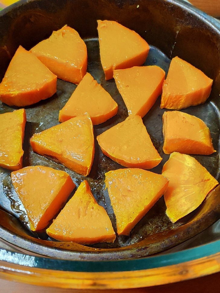 1. Тыкву порезать на кусочки, выложить в форму и поставить на верхнюю решетку аэрогриля на 15-20 мин при 175*.