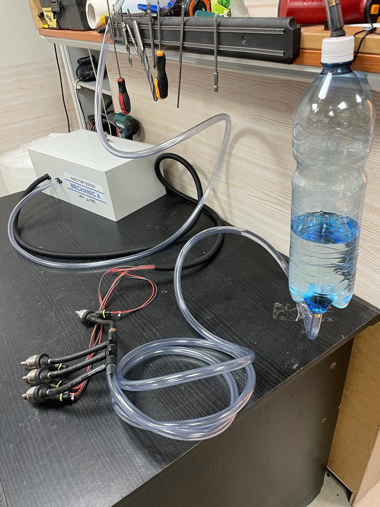 После того, как закрепили бутылку вертикально необходимо, ко дну подключить шланг, который пойдет к форсункам, а с верху в пробку подключить шланг давления от стенда.