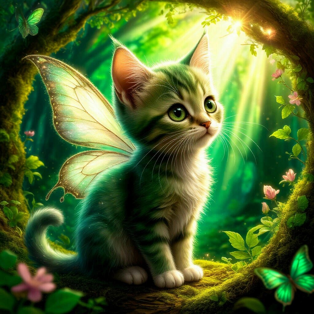 В глубине волшебного леса, где солнечные лучи пробивались сквозь изумрудную листву, жила маленькая фея по имени Мурлыка. Она была необычной феей, ведь вместо крыльев бабочки за спиной у неё порхали крошечные кошачьи ушки. Её задача заключалась в том, чтобы дарить котикам всего мира самые сладкие мурчащие сны.