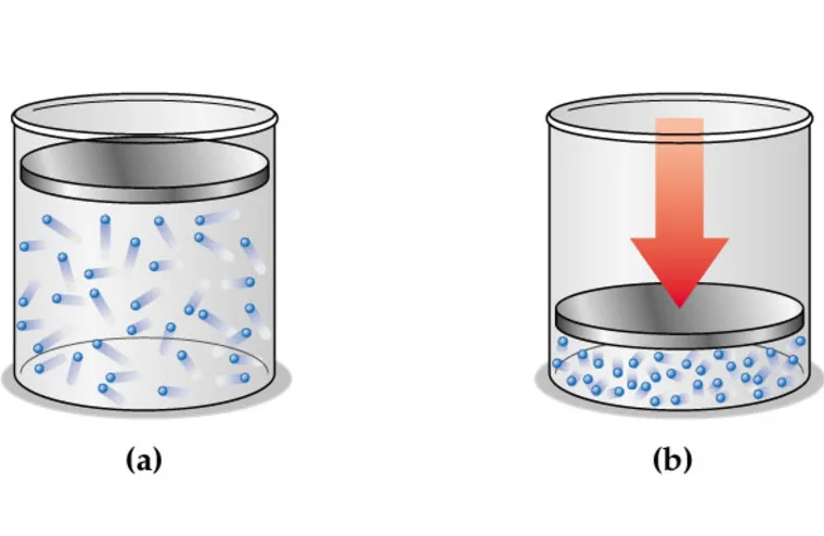 — Считаем процесс адиабатическим — если сжатие быстрое) Потому что: По уравнению состояния: P = n·k·T 👉 При сжатии — n ↑, и если T не падает — P ↑↑. ✅ Ответ 1: Давление растёт, потому что концентрация молекул ↑ и (при адиабатическом сжатии) температура ↑ → чаще и сильнее удары о стенки. Потому что над газом совершается работа — поршень “давит” на молекулы → ускоряет их → кинетическая энергия ↑ → температура ↑. По первому закону термодинамики: ΔU = Q + A Если сжатие быстрое — теплообмена нет (Q = 0) → ΔU = A > 0