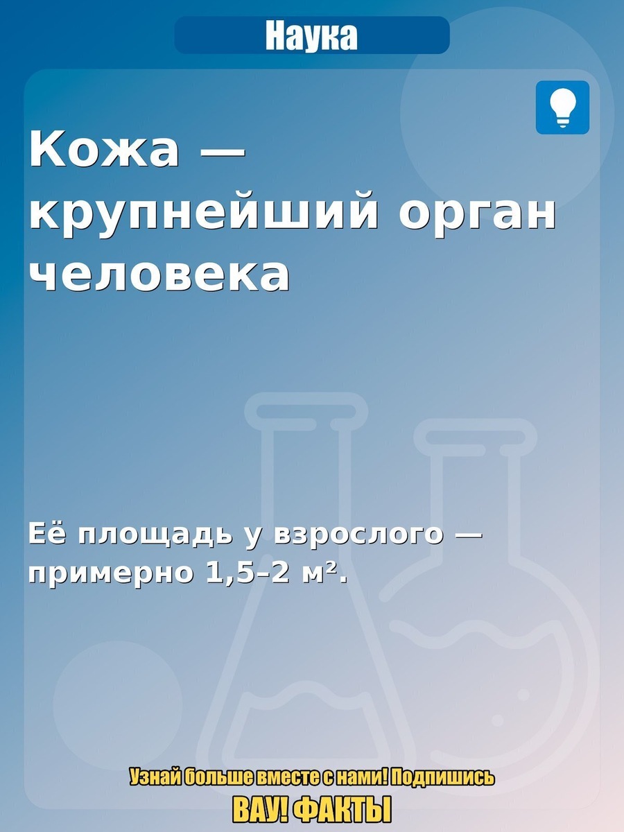 Кожа — крупнейший орган человека. Её площадь у взрослого — примерно 1,5–2 м². Интересный факт по теме «Наука»: Кожа — крупнейший орган человека. Почему так: Её площадь у взрослого — примерно 1,5–2 м².. Поделитесь в комментариях, знали ли вы об этом и стоит ли делать продолжение по теме. #наука #факты #интересно